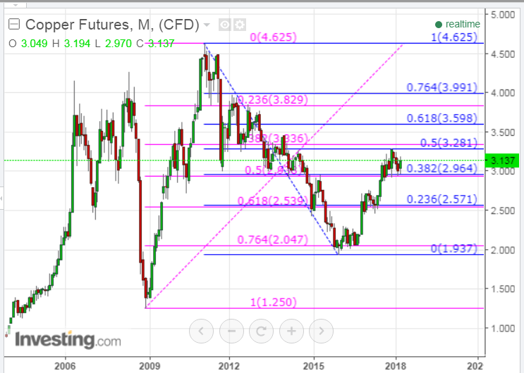 Lastly, the following monthly chart of Copper shows longer-term major resistance and support (as defined by overlapping Fibonacci retracement levels) around 3.30 and 2.94, respectively. A breakout (and hold) above or below this tightly congested zone could produce a sizable move to follow.