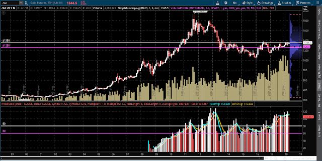 Chart #3 is a monthly chart of Gold (in the upper half) and the GC:GVZ ratio (depicted in histogram format in the lower half).