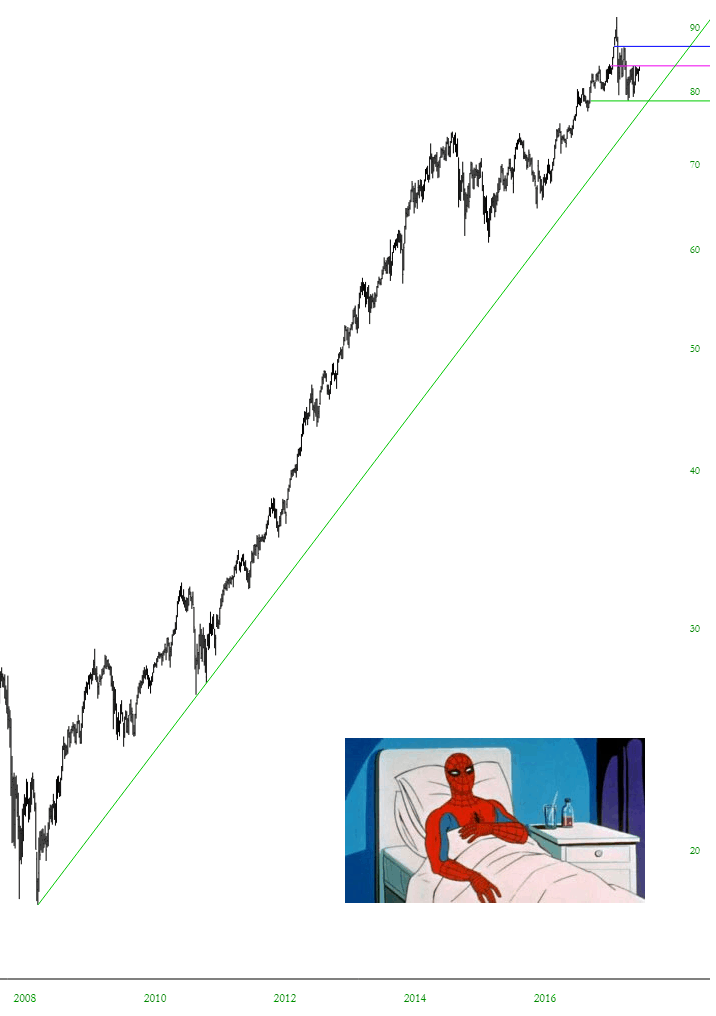 The health care sector ETF, shown below, peaked early this year and has been downtrending ever since. In particular, it has made three unsuccessful attempts to push back resistance, represented by the magenta line I’ve drawn.