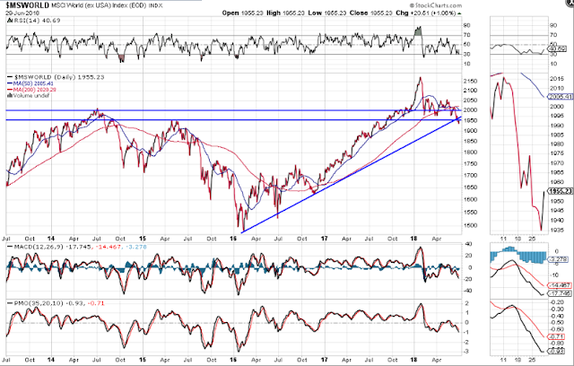 As shown on the daily chart below, a moving average “Death Cross” has formed on the World Market Index. It closed out Q2 2018 just above horizontal price support and below trendline support, as well as below both moving averages.