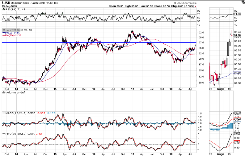 The next chart of the USD shows price approaching its next major resistance level at 97.50.