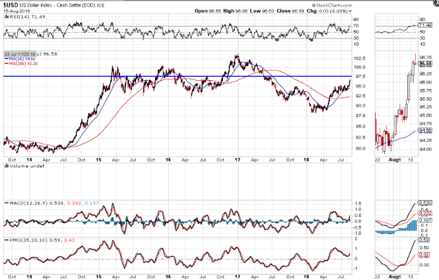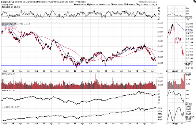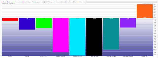 The last graph shows the percentages lost in the SPX, XLF, STOX50, EUFN, SSEC, GXC, EEM and EMB since they peaked around the end of January this year, as well as the gains made, conversely, in the USD.