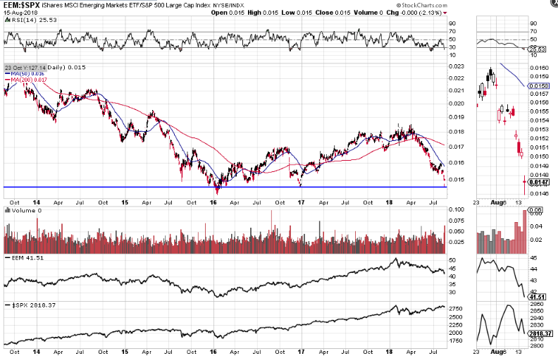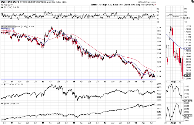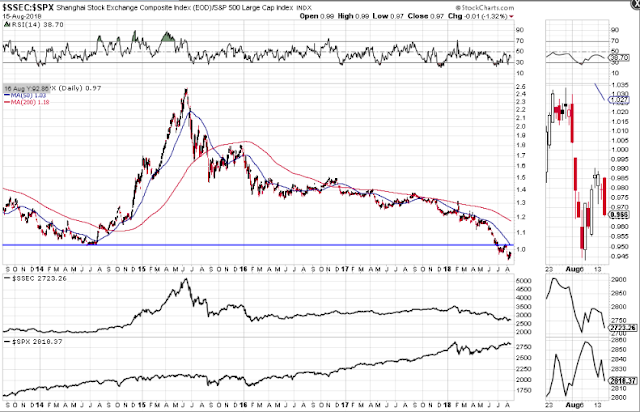The last three ratio charts compare price of the STOX50, SSEC, and EEM to the SPX. They are all much weaker than the SPX, the STOX50 and EEM ratios are sitting on major support, and the SSEC ratio is trading below major support.