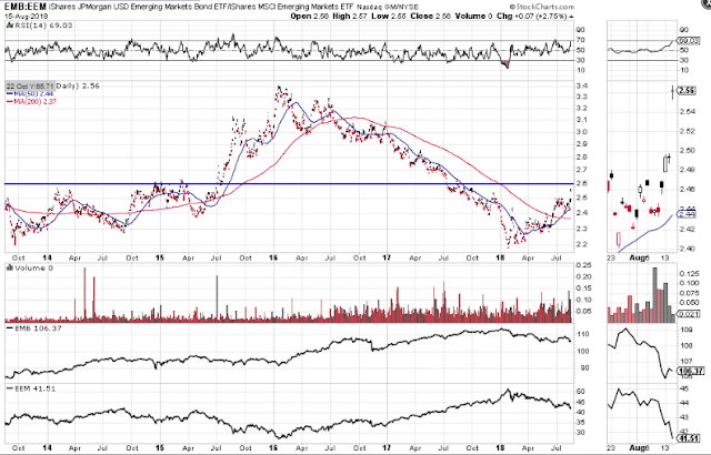 The next ratio chart shows the strengthening of the USD compared to EMB since the end of January. Price has a way to go before it hits its next major resistance level.