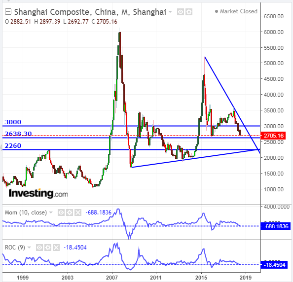 This index is in bear market territory and is headed toward its last (monthly) swing low of 2638.30, as shown on the following monthly chart of SSEC. A break of that level could see a swift drop to its next major support level of 2260, or lower.