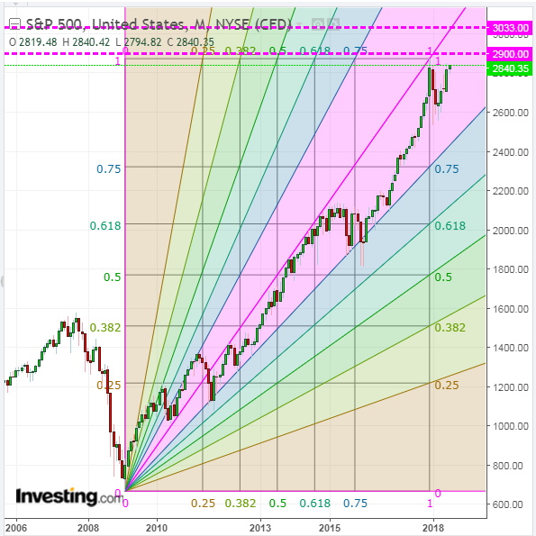 The second one is taken from the low of March 2009 to the high of January 2018, which was when the last record high was made. Based on this fan trajectory, the second major resistance level sits at 3033.