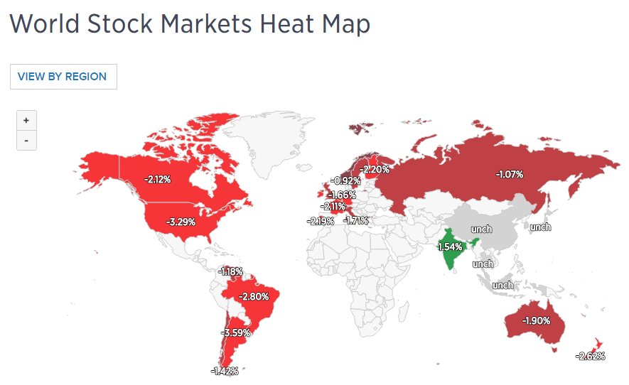 The first CNBC World Stock Markets Heat Map shows Wednesday’s big drop in North/South American, British and European markets.