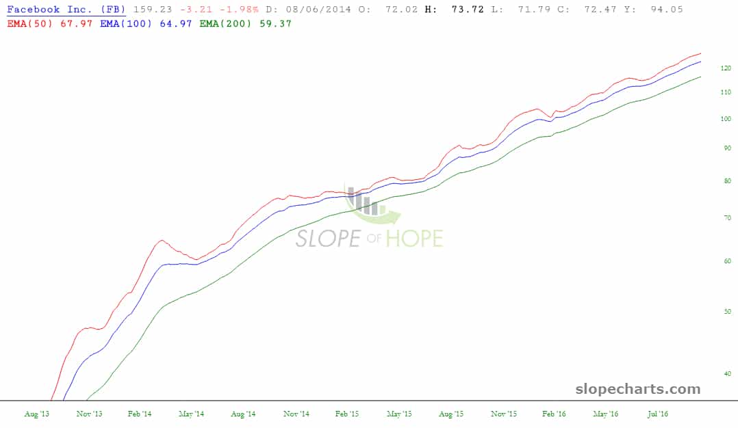 It was always this way, of course. For years and years, Facebook cruised right along, as reliable as a high-yield utility company in your portfolio (albeit a utility company that increased in value hundreds of percent). The moving averages were a steady stream of unbroken perfection.