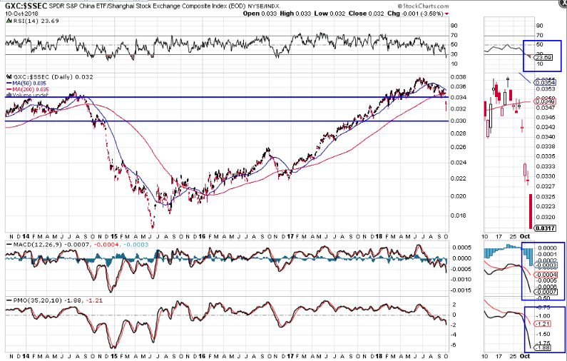 In my post of August 15, I mentioned that the China Financials ETF (GXC), on a ratio basis compared with the SSEC, was weaker than the index and that it would be important for the financials sector to attract new buyers, otherwise, we’d see the selling continue, or even, accelerate in Chinese markets.