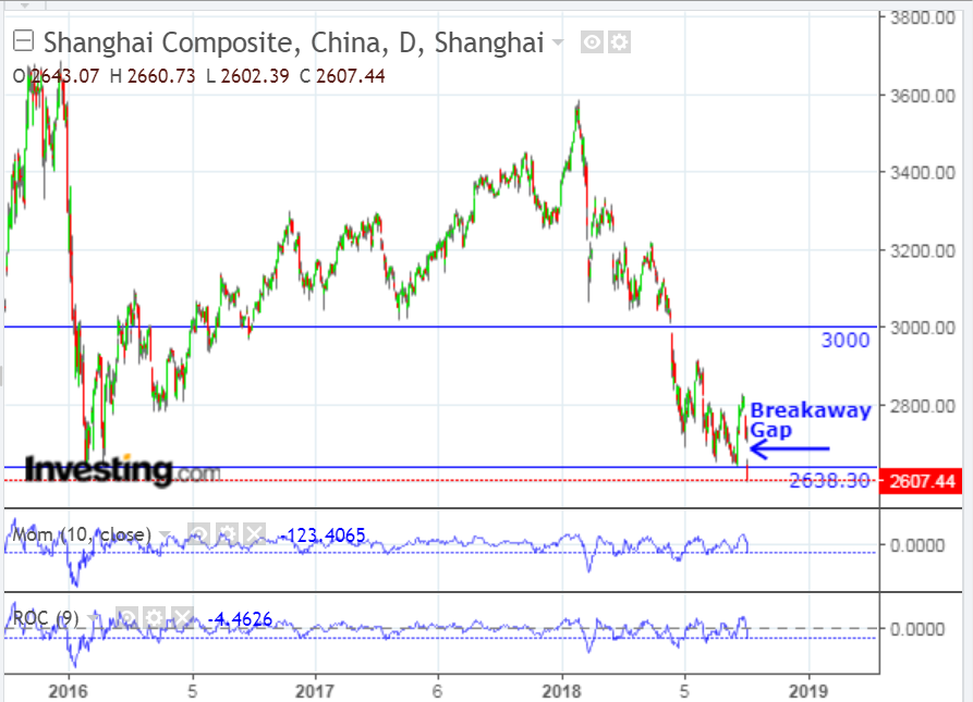 The Shanghai Index (SSEC) continued its freefall from its January highs with a breakaway gap below a large trading range and continued to fall in early overnight trading in China, as shown on the daily chart below.