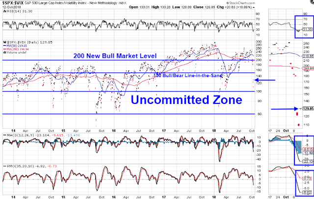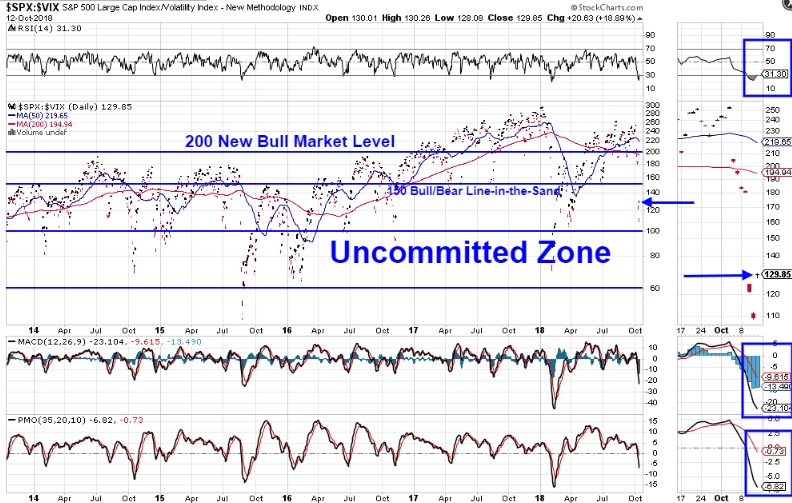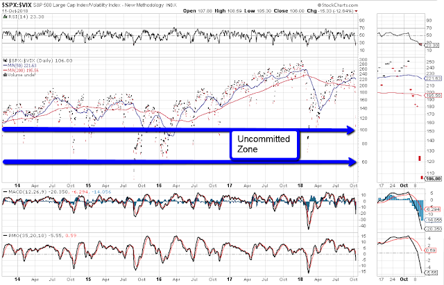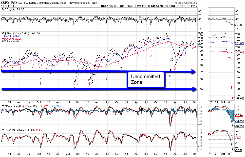 Price on the SPX:VIX ratio had fallen to just above a level that I’ve long referred to as the Uncommitted Zone (between 100 and 60), as shown on the daily ratio chart below.