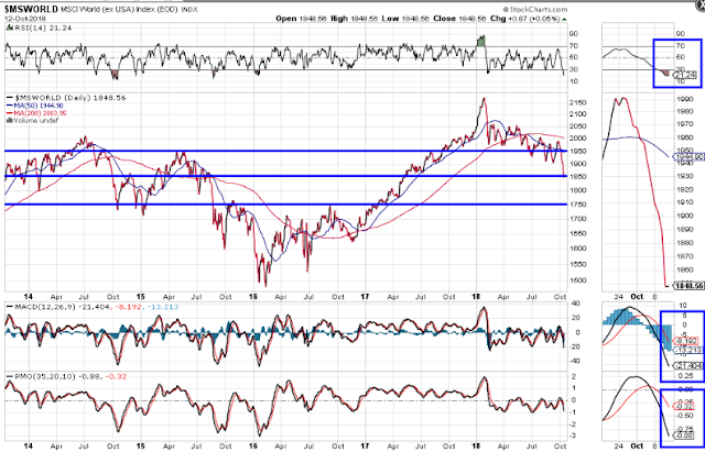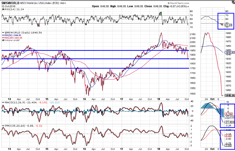 The World Market Index, which has lost 15% from its high on January 25 this year, is trading under the bearish influence of a moving average Death Cross formation, as shown on the following daily chart.