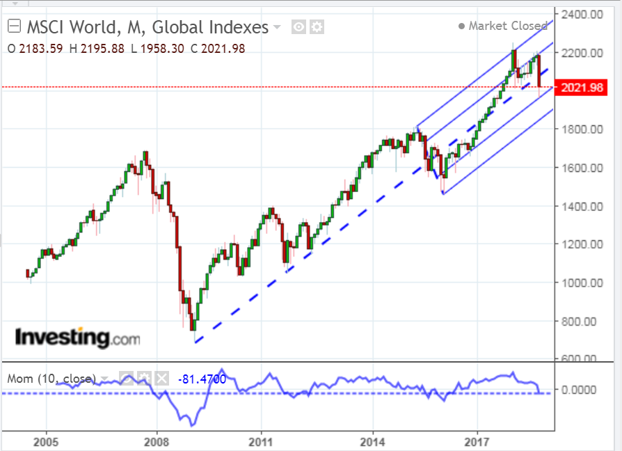 The following monthly chart of the MSCI World Index shows that price pierced below the median of a long-term uptrending Andrew’s Pitchfork formation on accelerating downward Momentum (MOM) and is attempting to bounce back to its median.