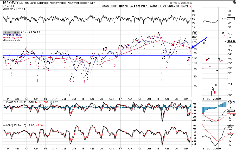 You can see from the following daily SPX:VIX ratio chart that volatility increased greatly (doubled) this year, compared with 2017.