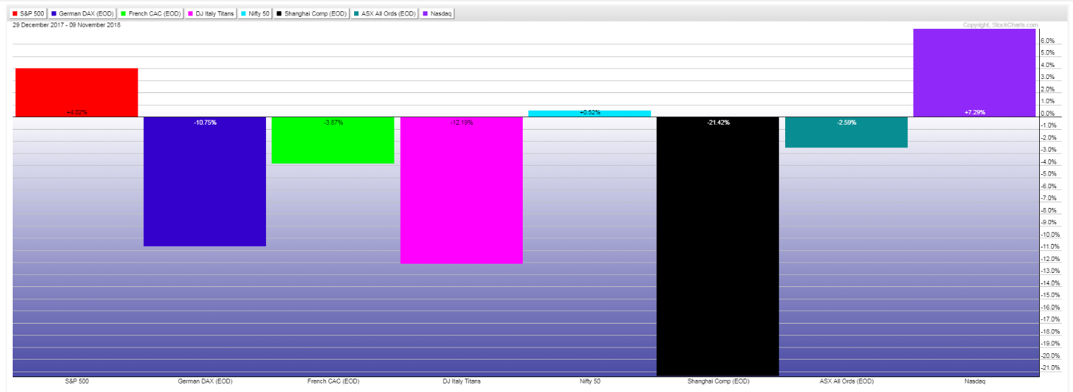 The following year-to-date graph shows that the Nasdaq Composite is the strongest, while the Shanghai Index is in bear market territory.
