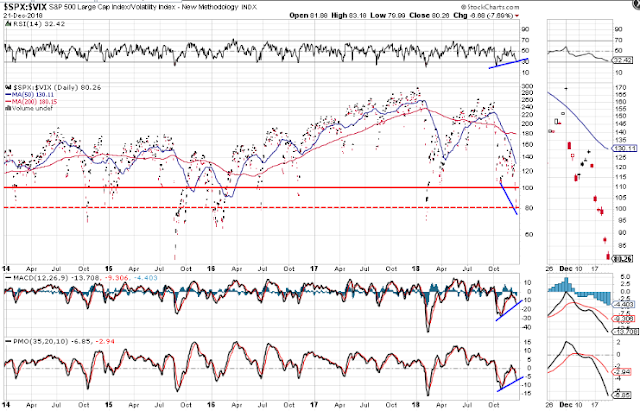 However, the RSI, MACD and PMO divergences (shown on the daily chart of the SPX:VIX ratio) compared to the ratio price is hinting that we may either see a bounce in the SPX or some stabilization soon.