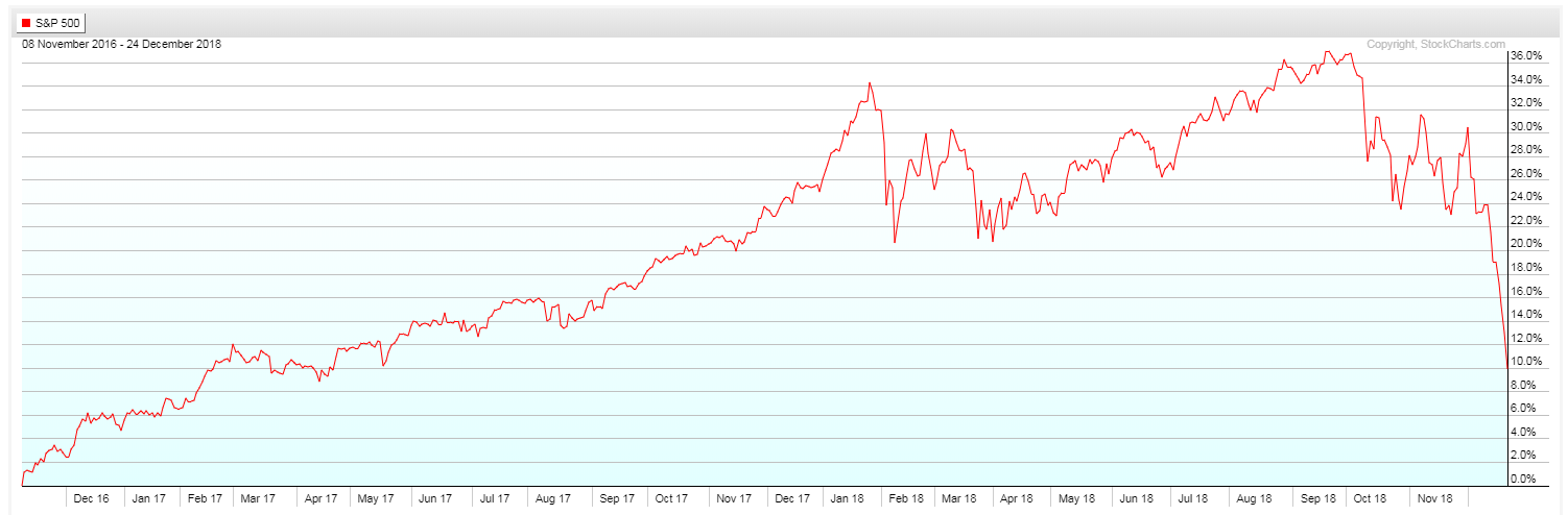Since September 21, the SPX closed Monday (Christmas Eve) 589.81 points lower at 2351.10…a loss of 73.6% of those Nov/16 to Sept/18 points gained…and is now up by only 9.89% since November 8, 2016, as shown on the following percentage-gained graph.