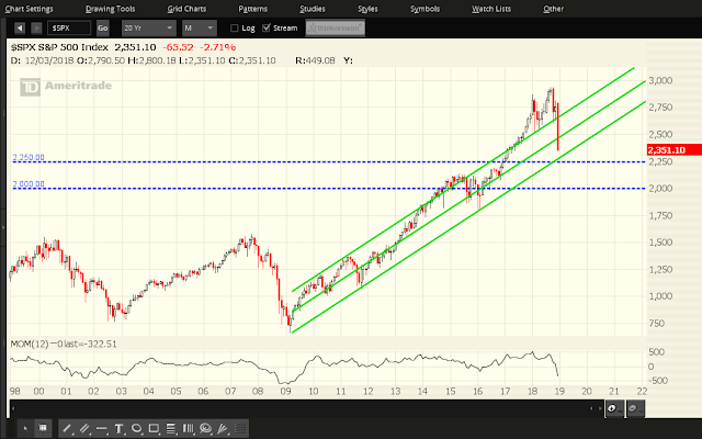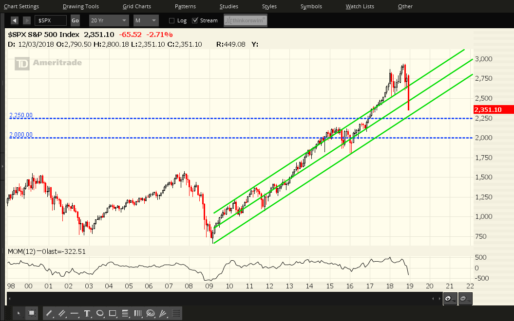 If we get a couple more days like Monday’s, the SPX could easily reach its first support level of 2250 before the end of the year, as shown on the following monthly chart, and as I described in my post of December 22. Major support sits lower at 2000.