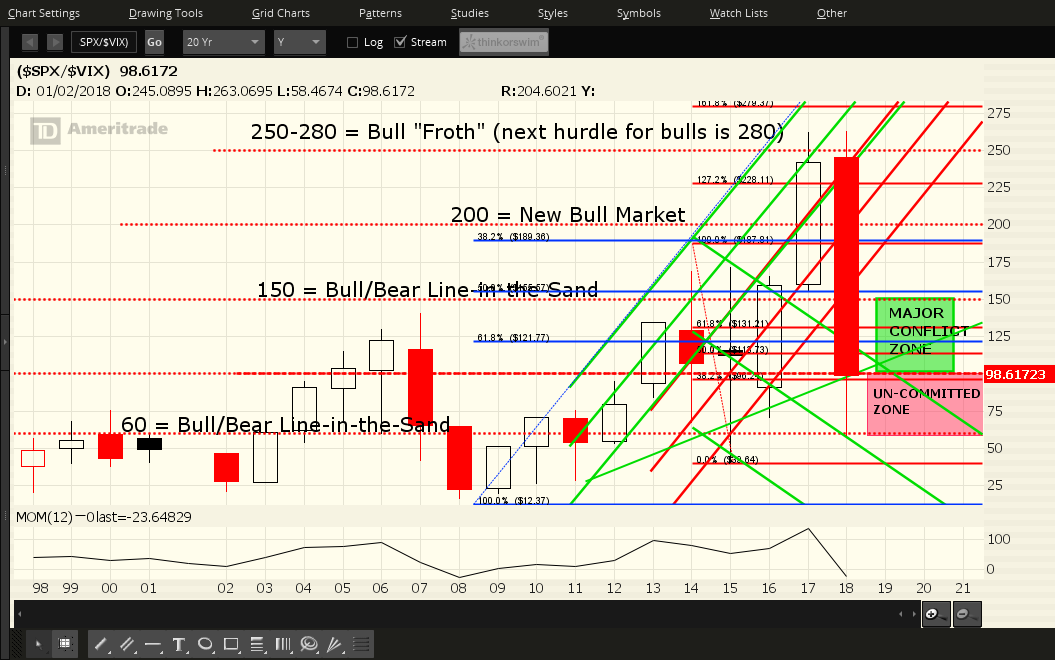 SPX:VIX Ratio — Each candle on the following ratio chart represents a period of one year.