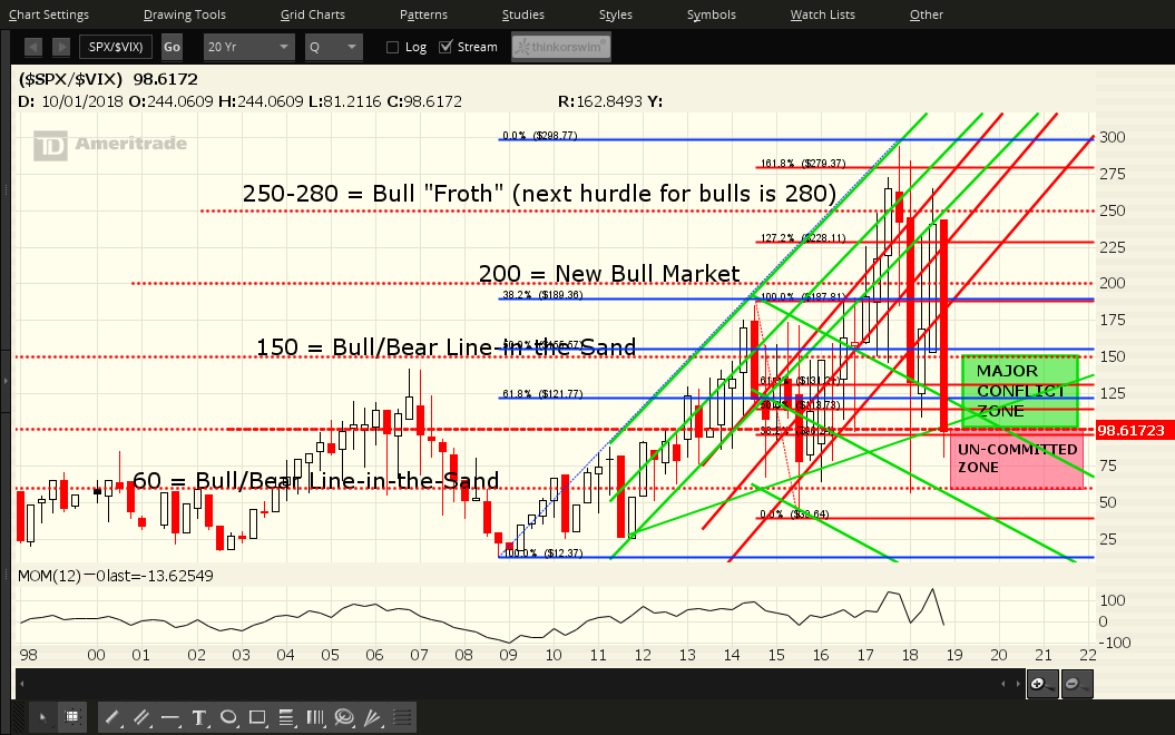 SPX:VIX Ratio — Each candle on the following ratio chart represents a period of one quarter.