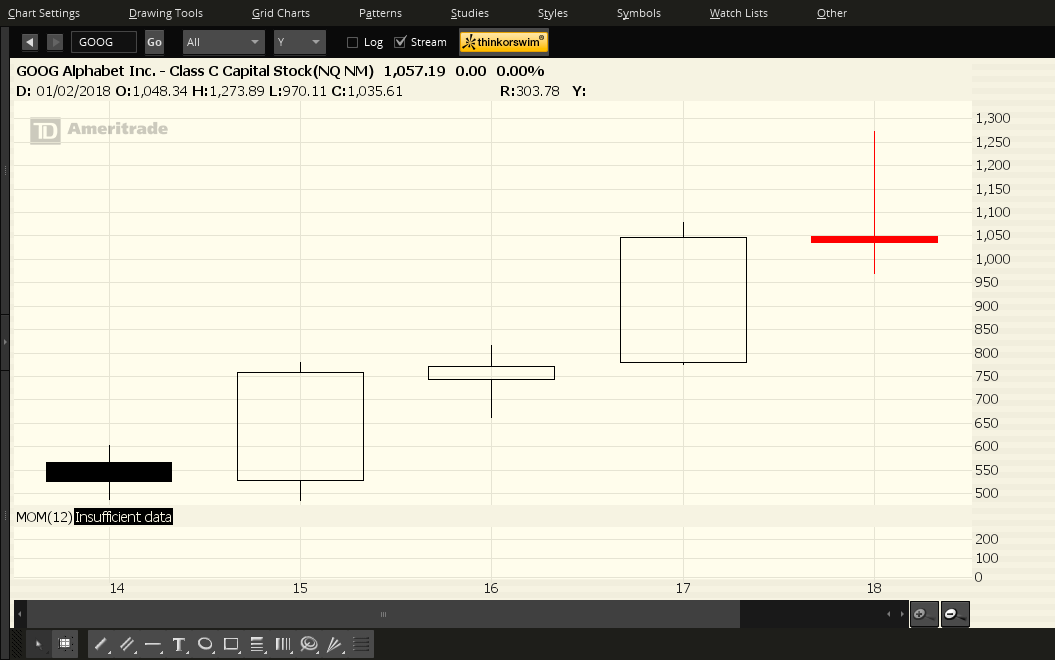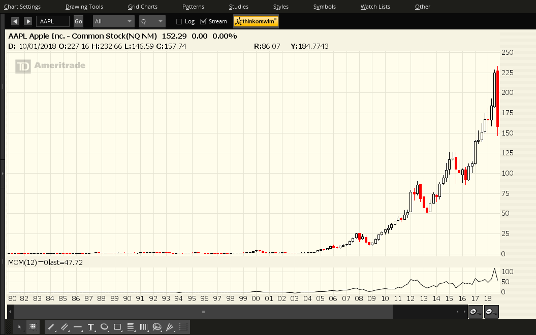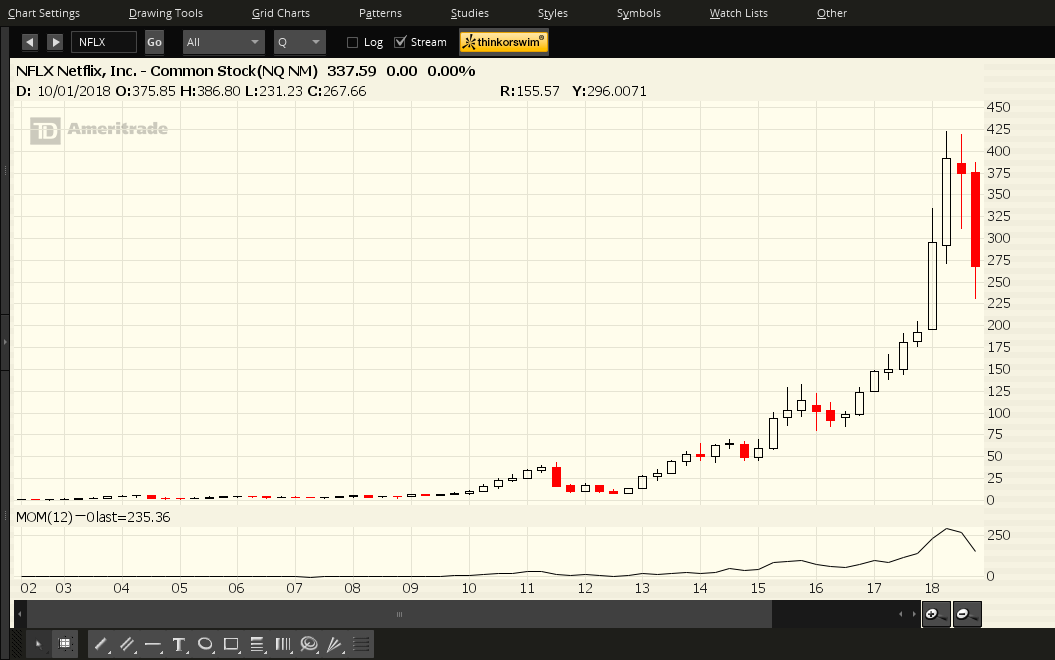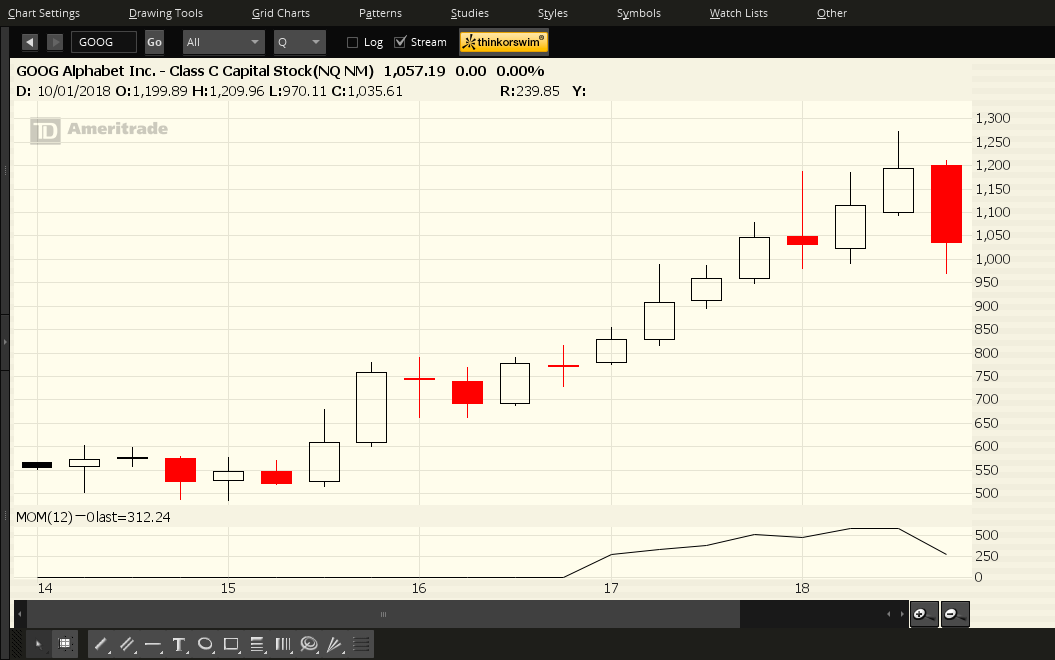 Each candle on the following charts of the FAANGs represents a period of one quarter. Also absent on this chart is 2019’s Q1 candle.