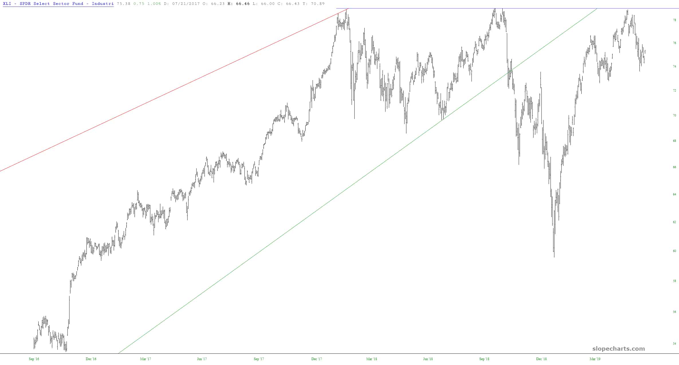 I’m usually fairly soft-spoken in my posts, but in January 2018 I did a no-question-about-it piece titled If You Buy Equities Here, You Are Insane (to which Dutch replied with the first comment “Yes they are.”) The chart I used to illustrate this was the industrials fund XLI: