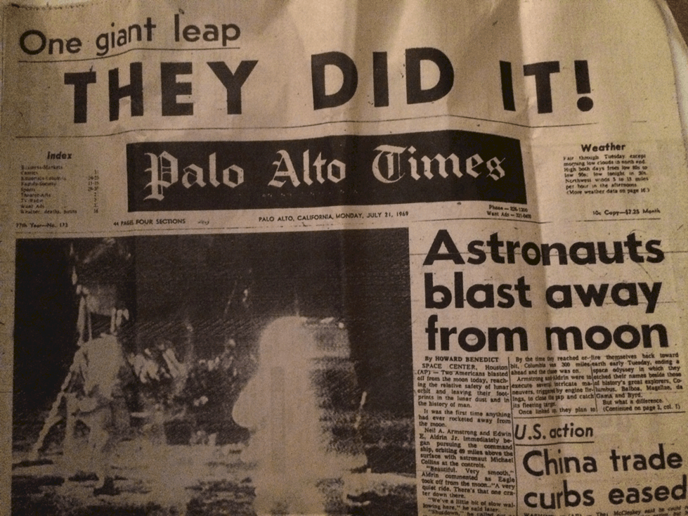 With the 50th anniversary of the first manned moon landing upon us, the local paper did a reprint of their front page from that day: