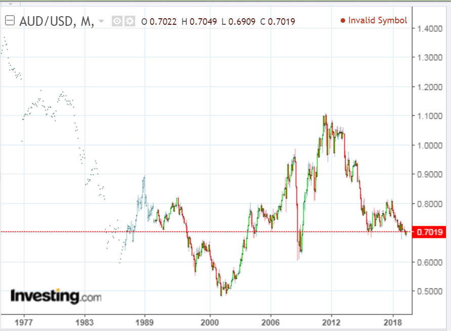 The monthly forex chart of AUD/USD shows that price is hovering just above major support at 0.70. If this level is broken with force and held, watch for continued China weakness.