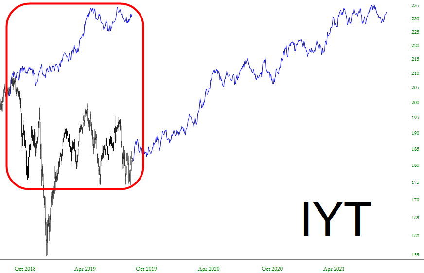 So let’s try it with the Dow Transports ETF. I have highlighted what it predicted for the past year, and the blue line to the right is the prediction for the years ahead. I think we can all agree that its past prediction stunk, so we’ll ignore it!