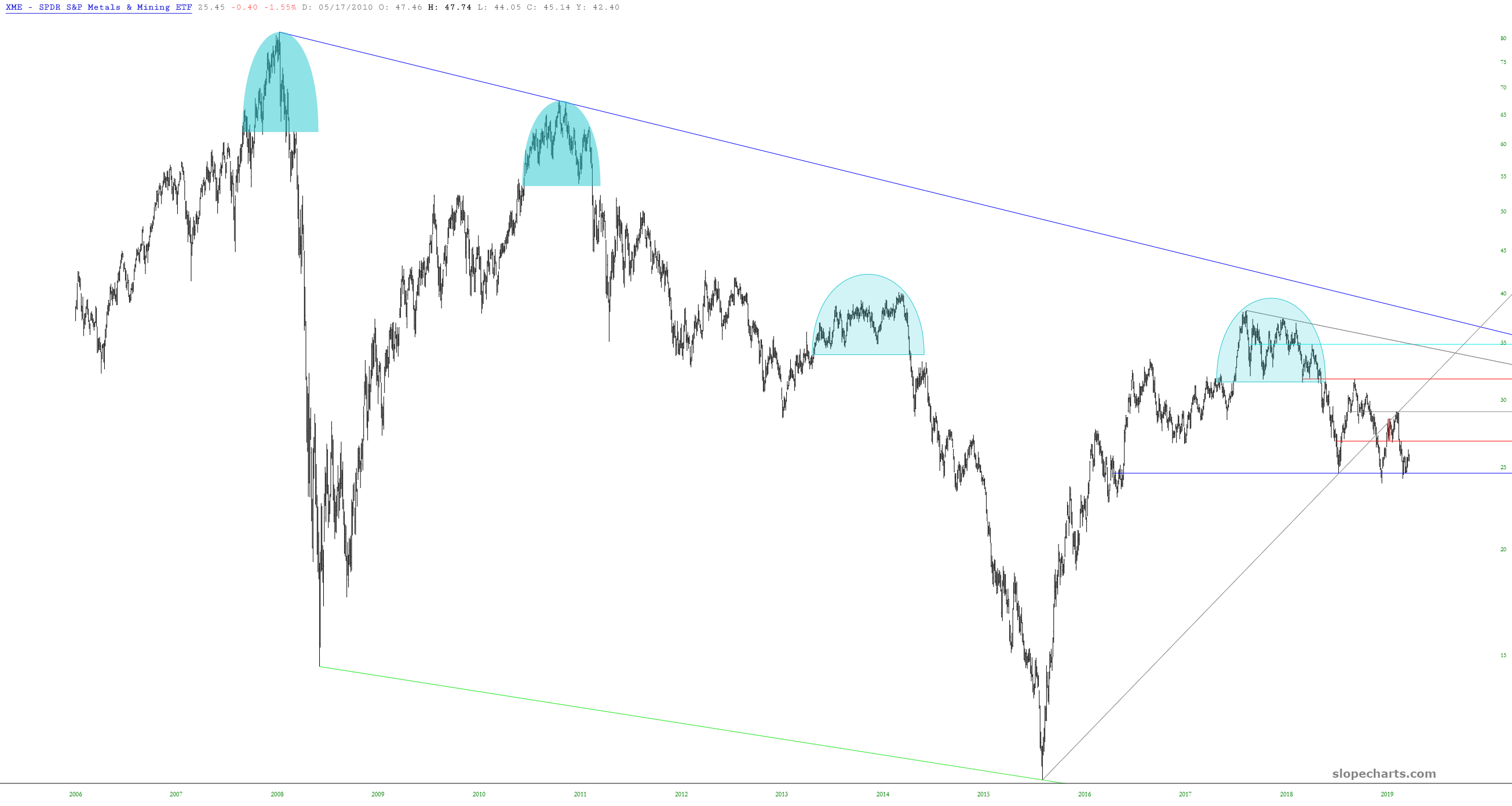 Second is the metals and mining ETF, symbol XME, which encapsulates the still very real global economic cycle. This pattern is more like 95% complete. Of course, neither 85% nor 95% is greater than 100%, so these are both speculative with a dash of hope.