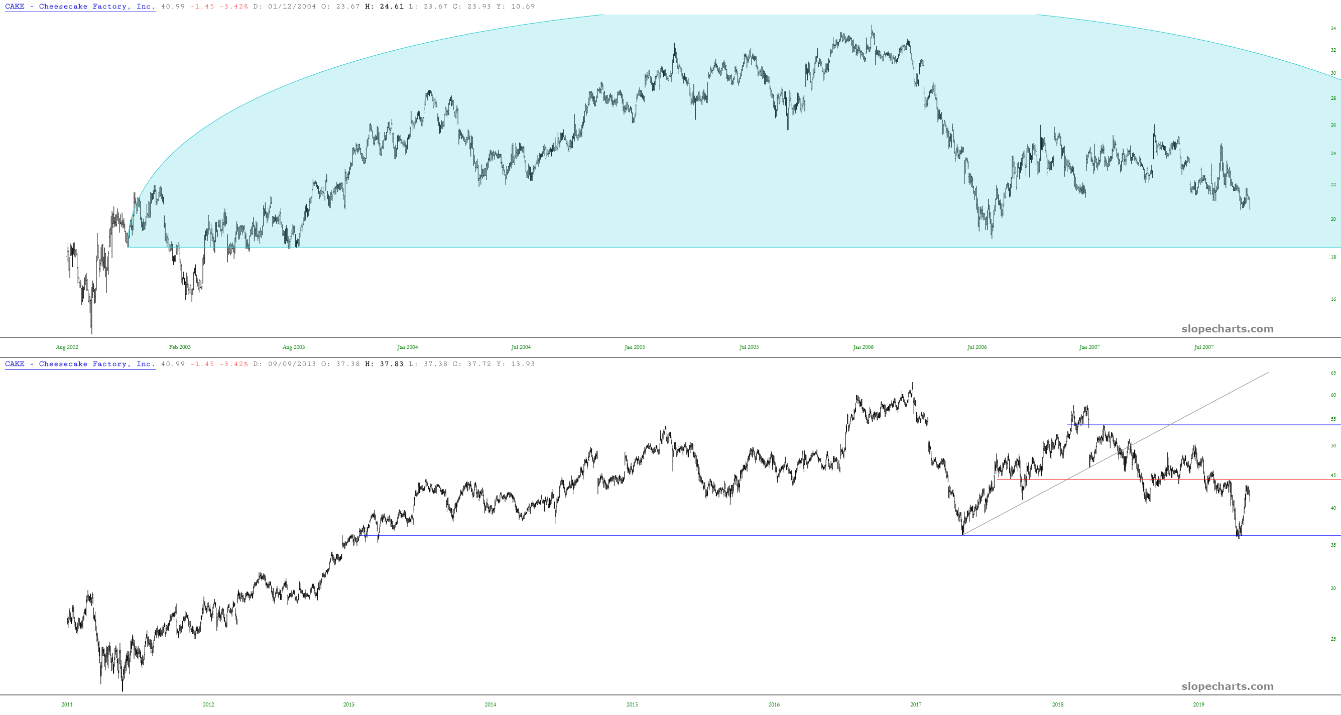 I have mentioned Cheesecake Factory many times as a short-sale candidate, principally because of its powerful analog and its obvious ability to plunge once a well-formed top is complete.