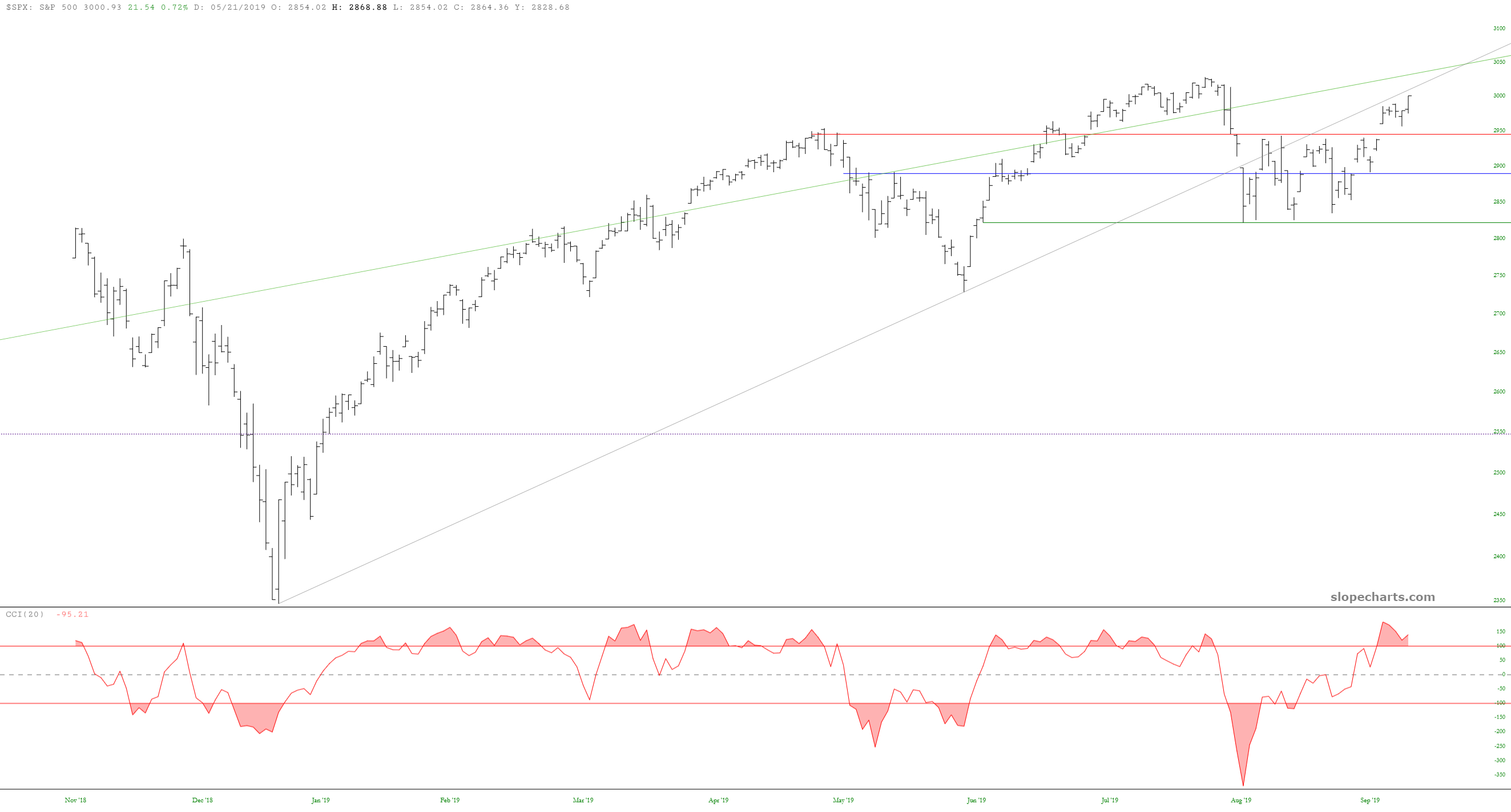 S&P with the CCI(20) showed a deeply oversold condition early in August, whereas we are in overbought territory now