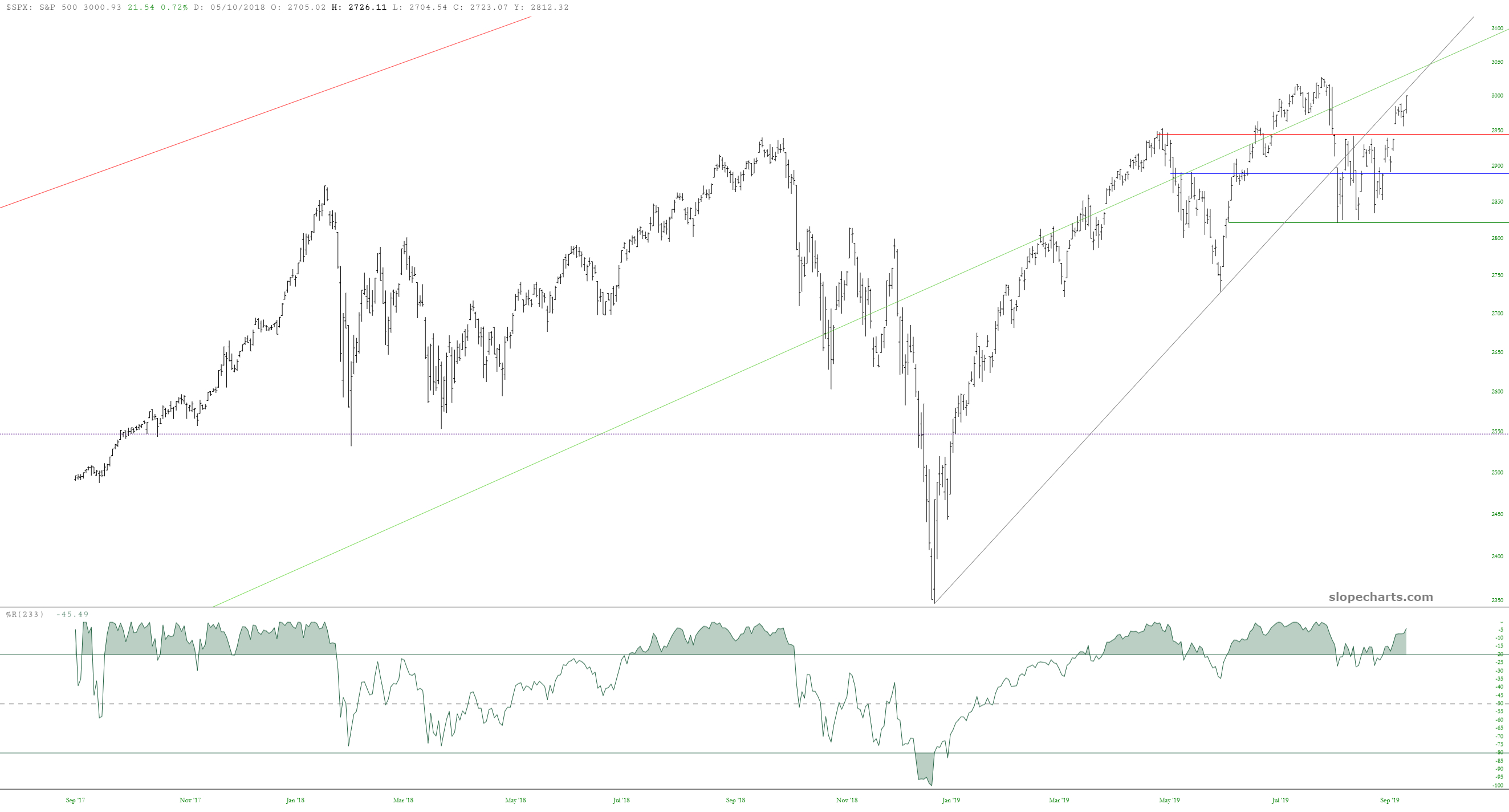 As I type this, the markets have surged yet again, thanks to more backpedaling from the President. I pulled the charts for this post before this latest surge, but the purpose is the same: what indicators were most helpful in nailing the bottom we saw in mid-August? I offer some SlopeCharts below, with remarks captioned for each.