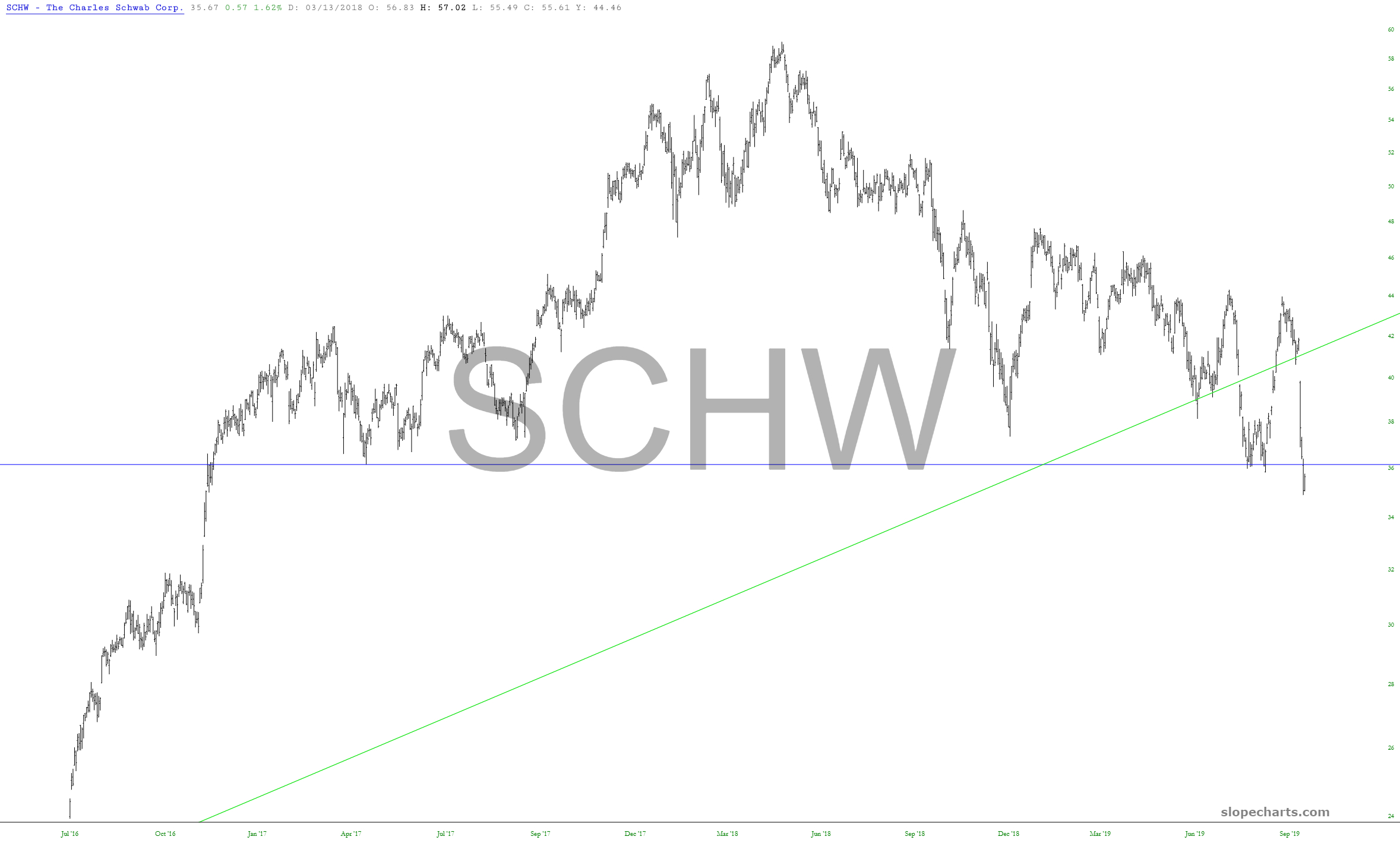 This past week, one sector which took it on the chin was the brokerages. The reason is easy enough to understand. Two important revenue sources for them are (1) commissions and (2) interest on deposits. And yet (1) commissions are going to $0 across the board and (2) interest rates are plunging, and ultimately, I believe, will be negative. So here is the kind of catastrophe these companies are facing, with most of them down nearly 50% from their highs last year: