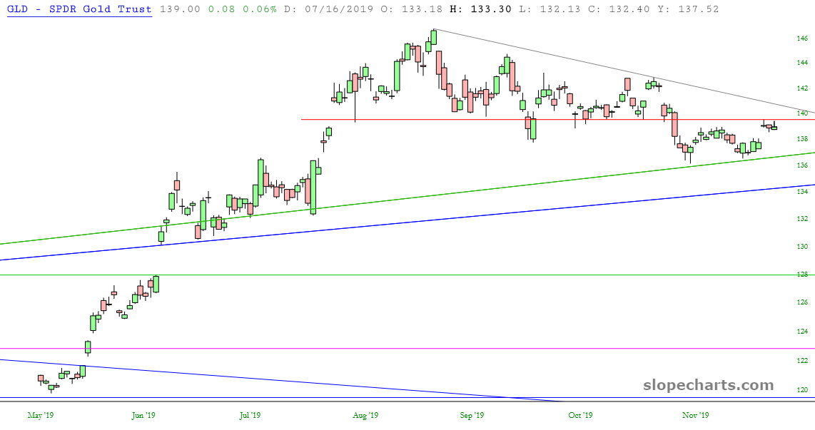 DIA: broke its medium-term uptrend a few days ago; still below its price gapGLD: needs to conquer that horizontal resistance and, more importantly, the descending trendline in order to escape the clutches of its right triangle patternITB: still a solid bullish uptrendIWM: range-bound for over an entire year, but a recent bullish breakoutIYT: still range-bound, and has remained below the price gap created a few days agoTLT: as mentioned to gold/diamond members two days ago, this tagged its descending trendline perfect; it needs to break above it to help out any surviving equity bearsXLF: financials have also broken above a large base; bullishXLI: industrials, similar to financials, have broken above bullish base