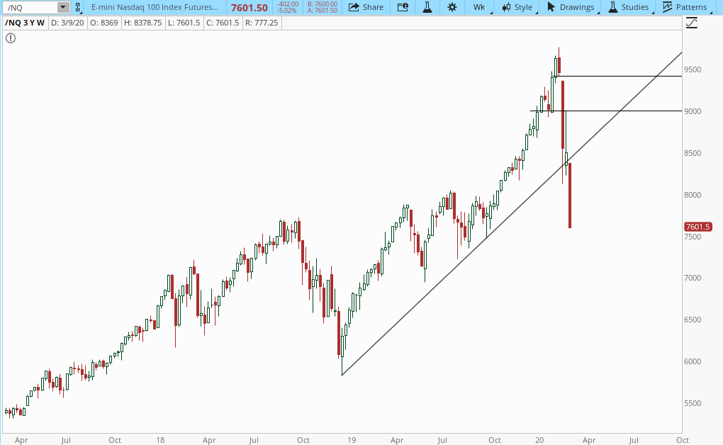 Now, closer to home, it’s just another day in paradise. Here is a weekly chart of the ES, showing the shameless free-fall.. Let’s keep our eyes on that trendline for support.