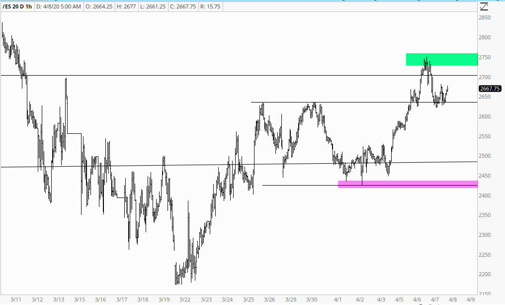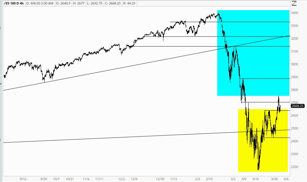 Taking a step even farther back, to the four-hour chart, we can see the entire run-up to the lifetime high of the market (which feels like it was about fifteen years ago, but wasn’t even two months) and the staggering mountain of overhead supply which exists. That teal zone is the best friend in the world to the bears. Face it, with trillions and trillions and trillions of dollars thrown at the market, this is what they’ve got to show for it: