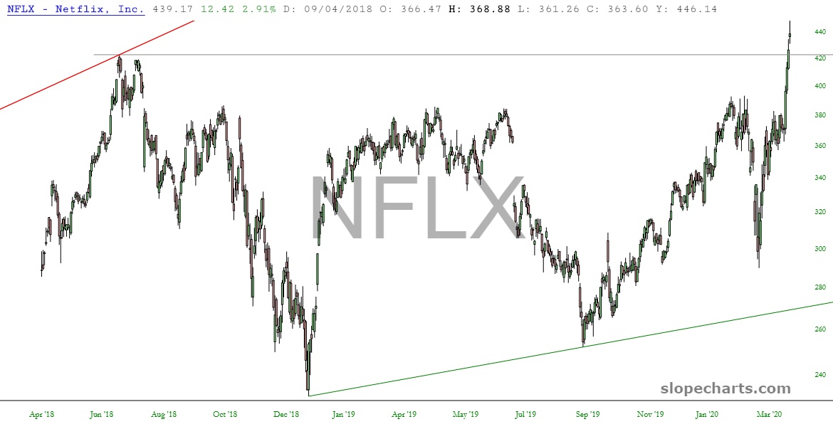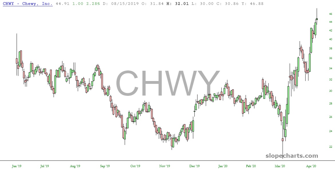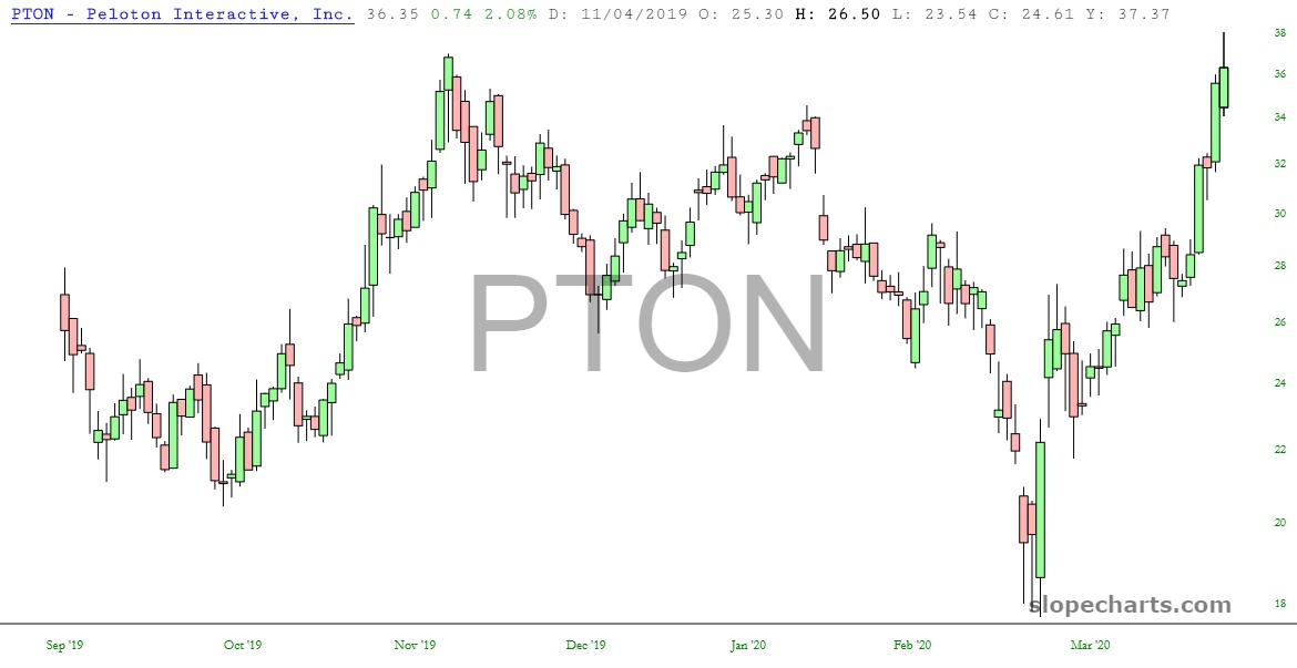 Although all eyes are peering toward a “return to normalcy“, the stocks have been thriving the most lately are those that cater to people sheltered at home. I’ve been pointing some of these out, including this post from yesterday. Here’s are some updated charts………I suspect one or two of these might have some “backlash” if people return to work en masse (like Zoom and Peloton).
