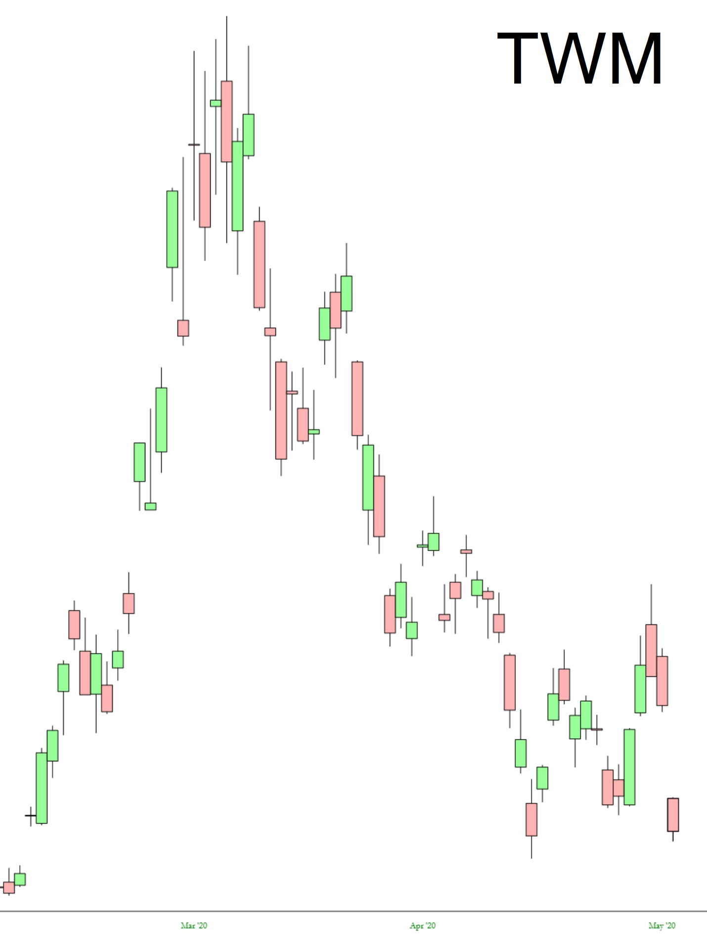 Speaking of small caps, here’s an interesting little object lesson about leveraged funds. Below is the TWM, which is the double-leveraged based on the small caps. In short, this thing went up way more than 100% during the market’s selloff, and then it absolutely gave back every penny of those gains. What is interesting about this is that the small caps (that is, the Russell 2000) is far, far below where it was when the selling began, but the persistence of the recovery has obliterated the bearish fund shown here.