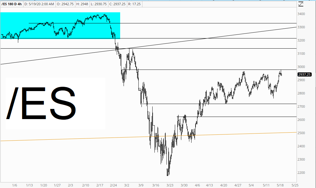 A less extreme recovery is shown in the S&P, by way of the /ES, which is bonking its head on the horizontal, tagging the top of a price range which has been in place for a solid month now.