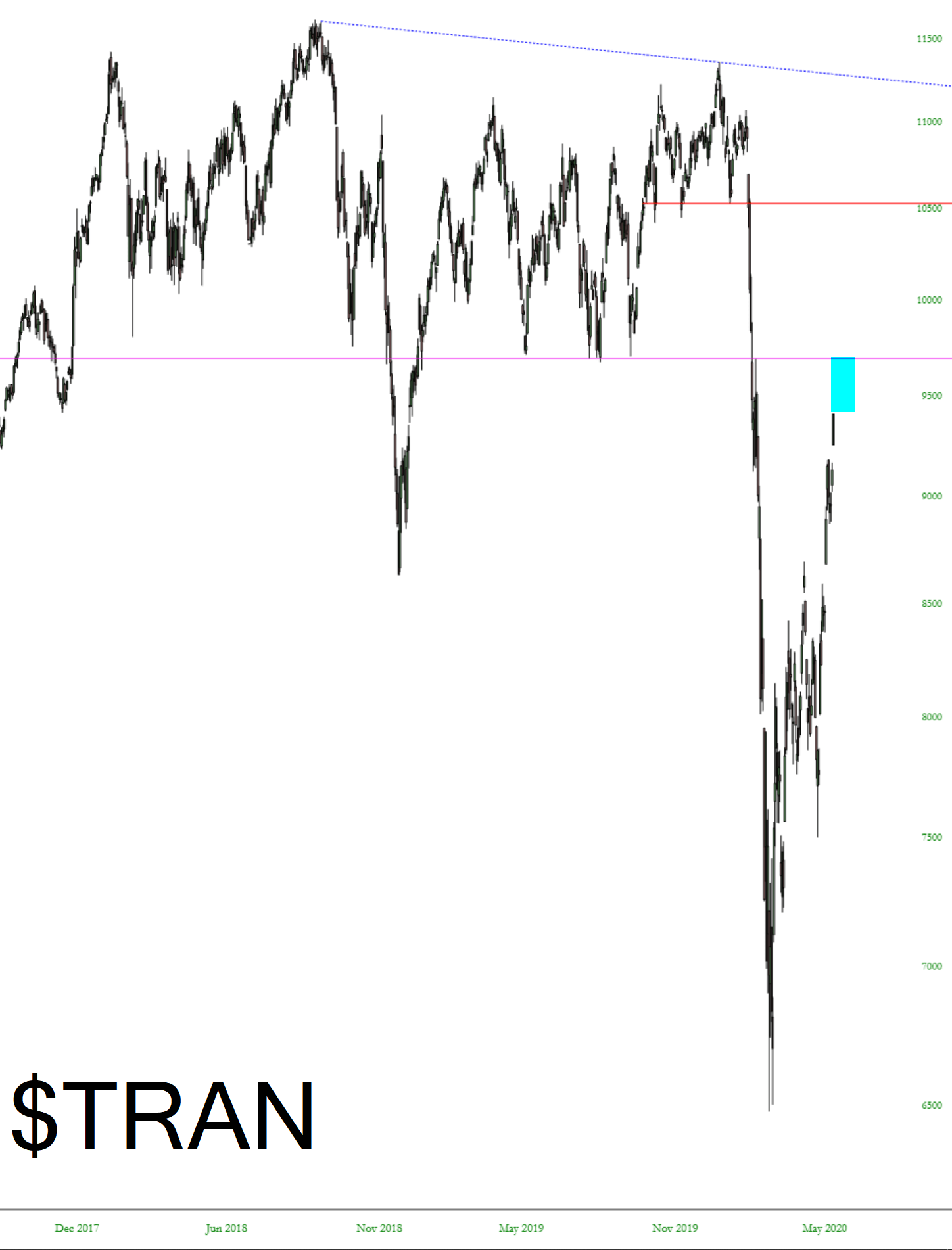 We are clearly into the manic phase of this ascent, as you can practically see people punching each other out of the way to press the Buy button. Here are a few major cash index charts showing that there is definitely more room to roam on the upside, and the next chart “event” to watch for is the underside of some massive, broken trendlines. I’ve tinted the spread between present price levels and those underbellies:
