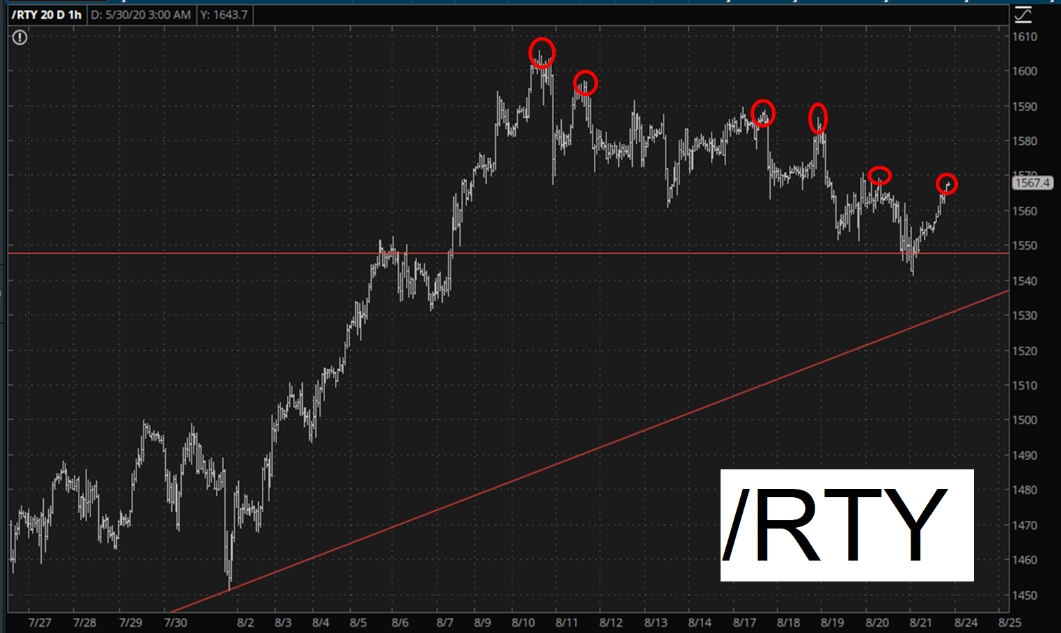 A longer-term chart of the ES shows that we’ve marked yet another never-before-seen high in the market. Are we slated to simply move up .5% to 1% each and every day in perpetuity. Perhaps. No meteor appears to be forthcoming.