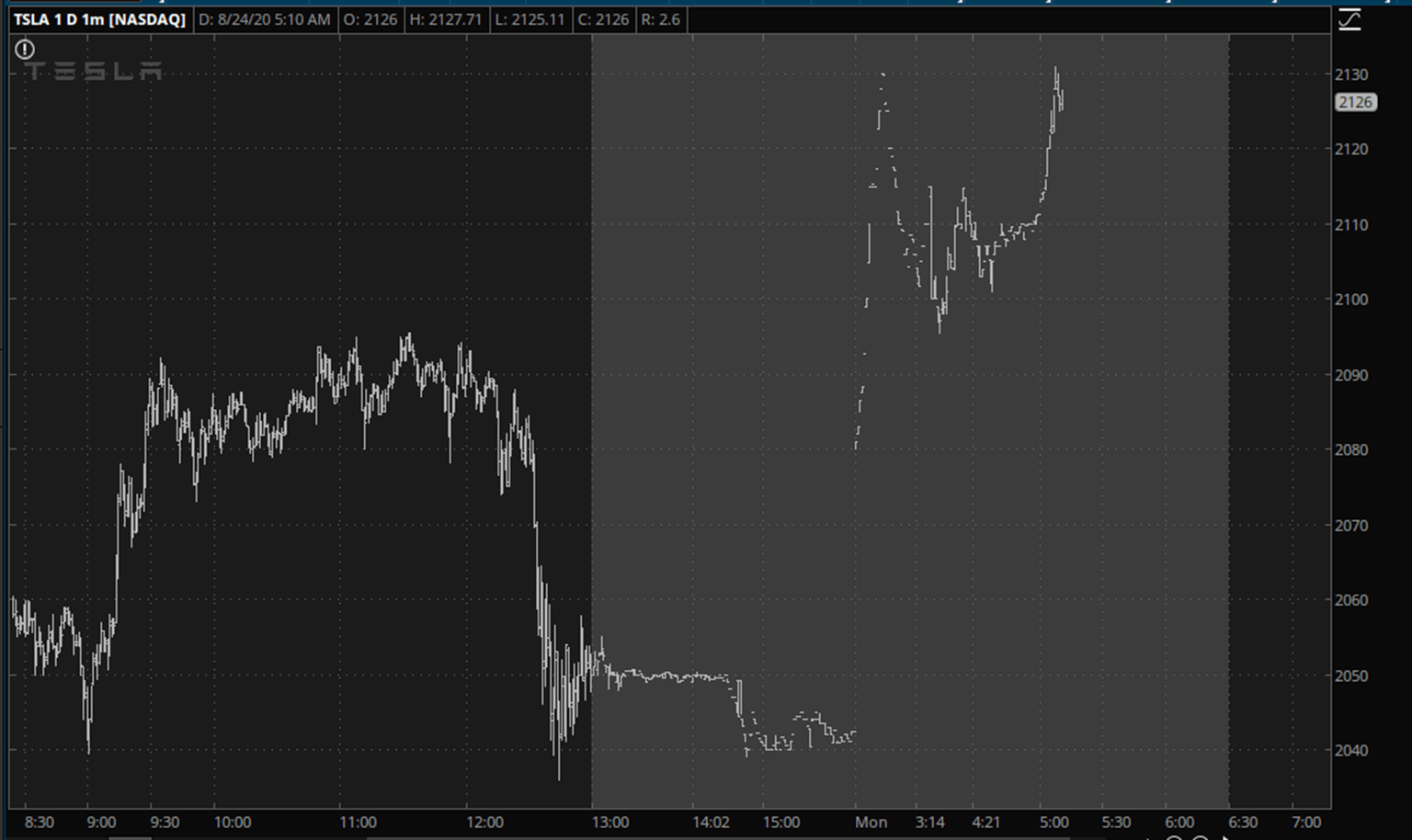 This is reflected in a more extreme sense, naturally, in the highly-visible high-fliers that keep ripping 5% or more day after day. The poster child for this is, naturally, Tesla, which pre-market is above $2100 for the first time ever. I did a post on Friday to premium members about my target for this stock, and it seems to be moving there crisply.