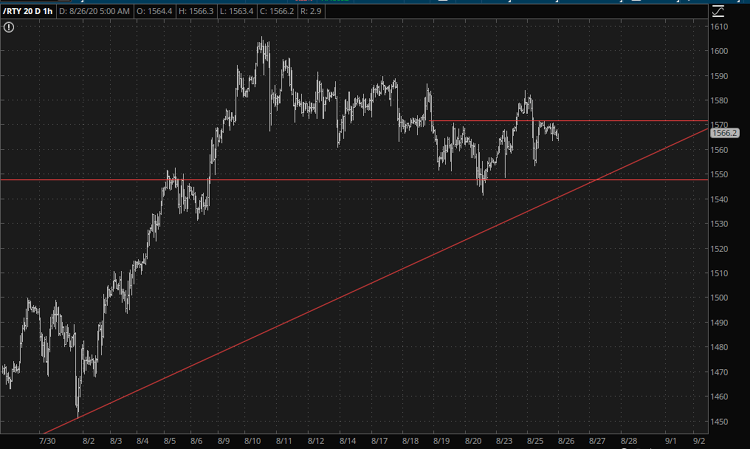 Here is the longer-term view of the small caps, by way of the /RTY futures. We are tightly range-bound at the moment, and the ascending trendline you see goes all the way back to the March bottom. Breaking it would be a big deal.