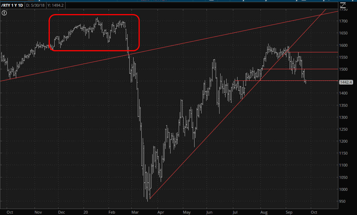 My own opinion – – surprise! – – is wildly different. I think the Dow’s true value is much closer to 0.00 than 30,000. I am thus heartened to see equities continued to bleed out. as the RTY minute bar char indicates.