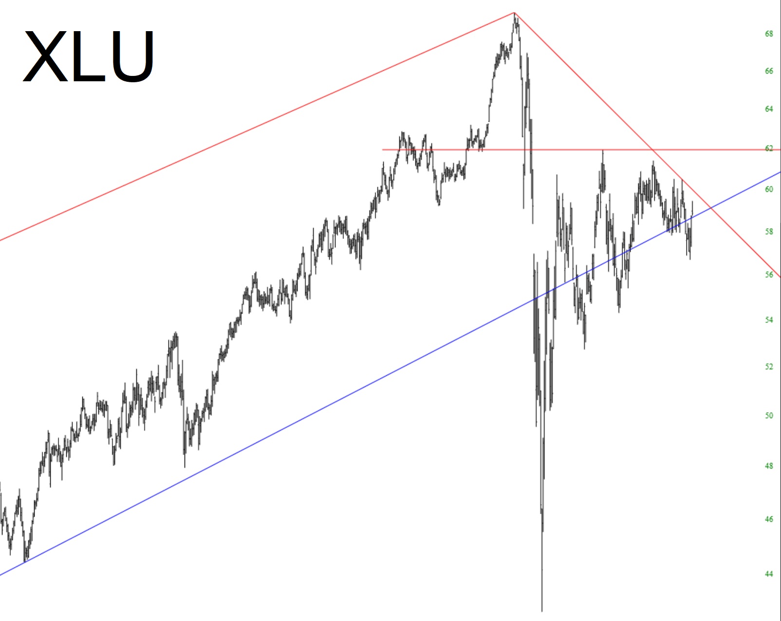 I’ve got 48 individual stocks sold short, and 2 ETF shorts: those are EWZ (Brazil) and Utilities (XLU, shown below). I also have January 2021 puts on XLU, which I find to be a captivating pattern.