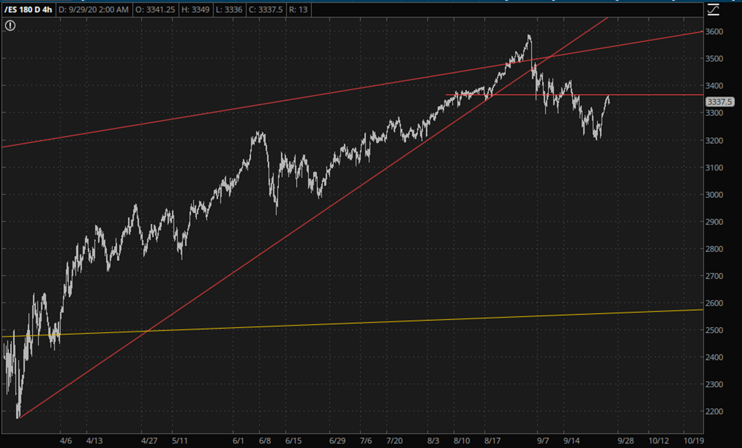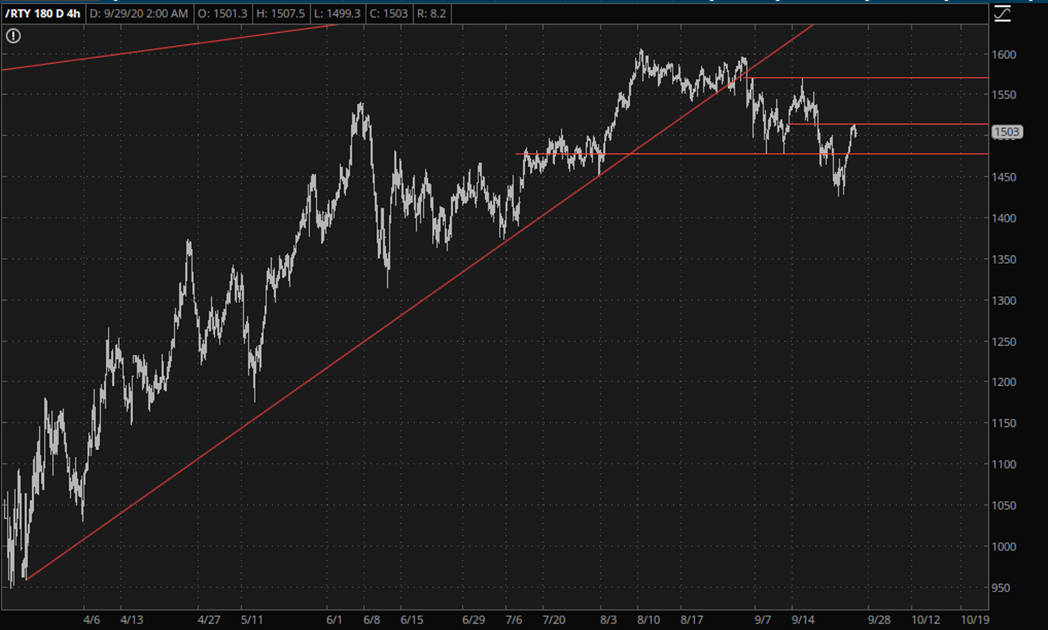The ES is sporting a similar setup: that is, an ascending trendline from March (now broken) and a fairly recent topping pattern forming over the past couple of months.