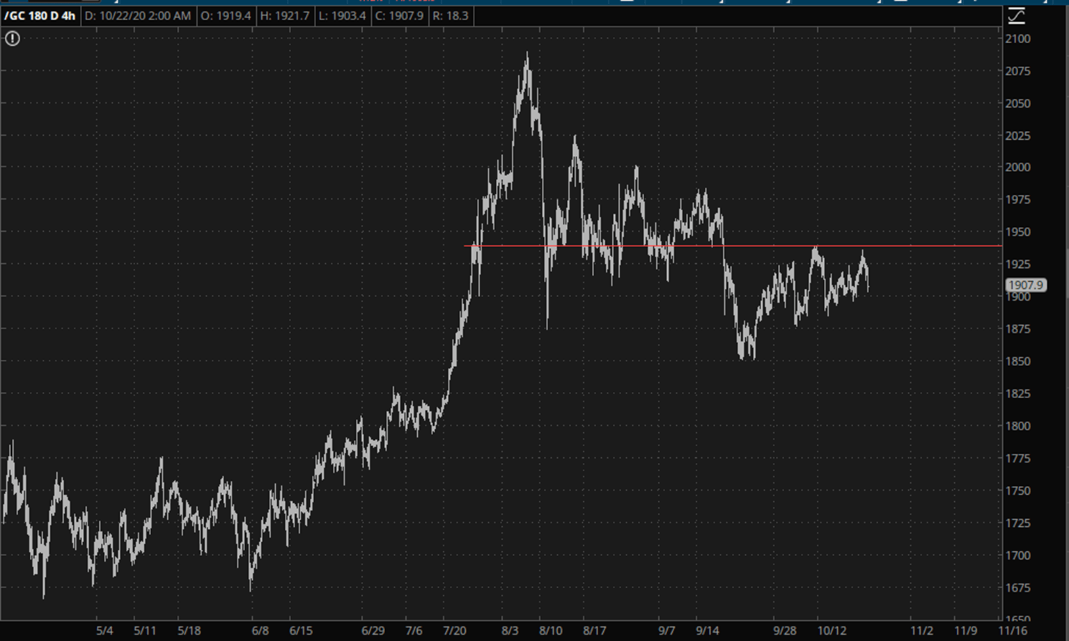 Gold had a good pop yesterday, but bang, that’s gone. Its own horizontal isn’t as clean, but this remains bifurcated: short-term, very vulnerable to weakness, long-time, looking great.