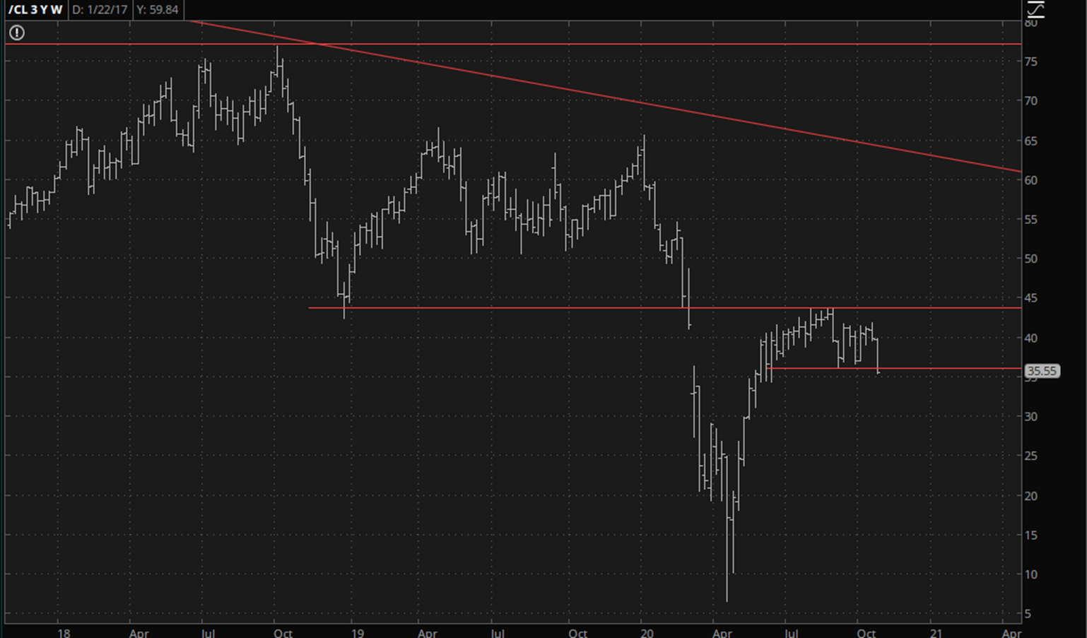 My favorite chart to make this point is the long-term continuous futures contract. Hey, you tell me – – look like it’s revving up for a fantastic bull market to triple digits, or is it as doomed as doomed can be? I’m voting doomed.