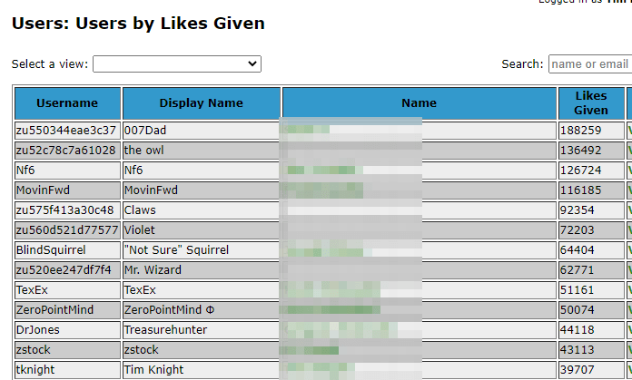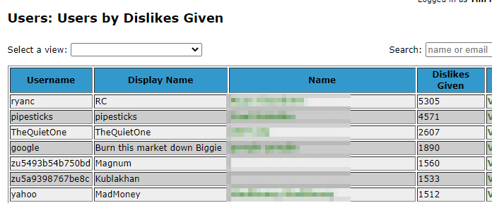 Anecdotally, we might guess where all the “Dislikes” are coming from, but I’ve got the data. (As a courtesy, I have blurred out the actual names, since Lord knows there is a lack of civilized decorum in present society). One of these chaps is dead, so no more worries there, but it looks like some folks spend an awfully lot of time bashing that downvote button. Thousands upon thousands of dislikes.